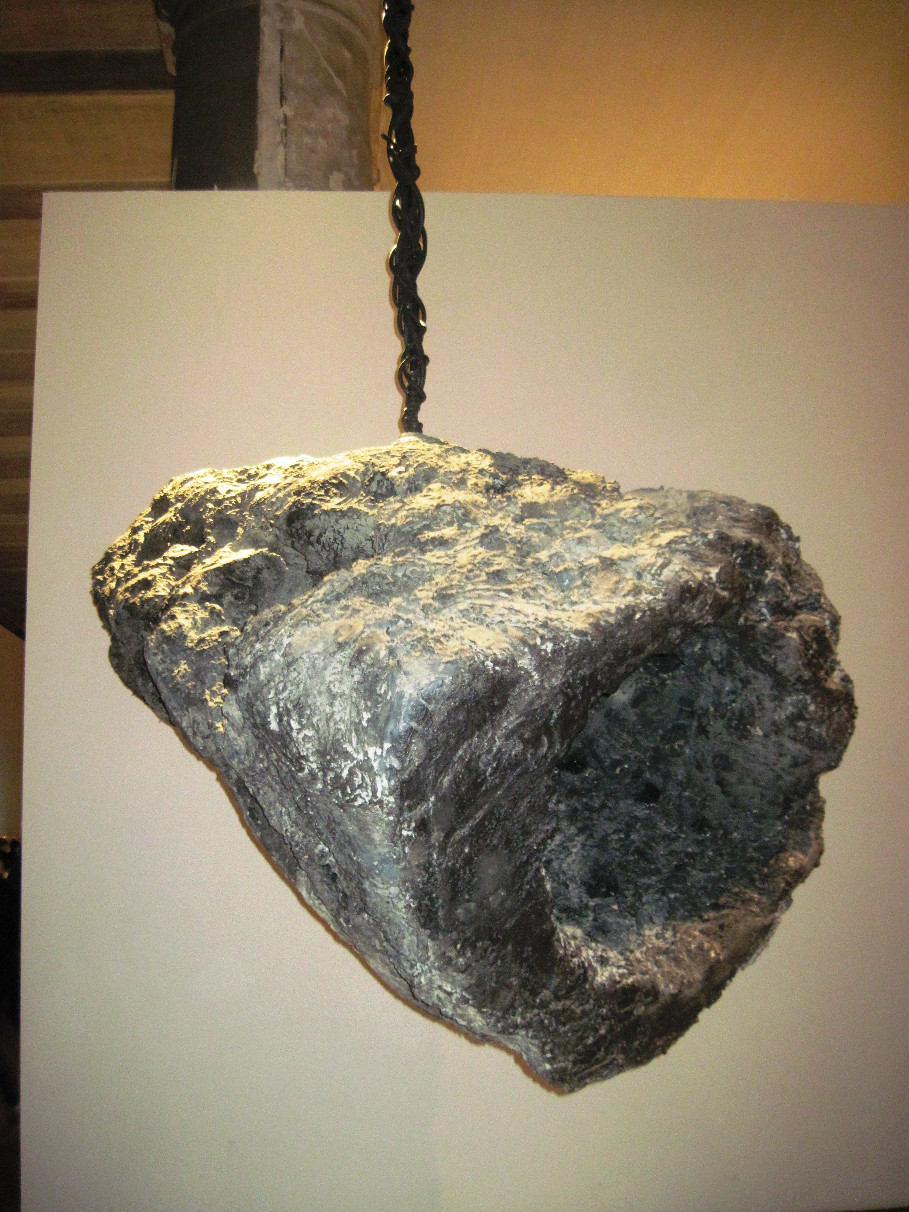 l’invadenza di queste opere  – che pendono minacciosamente dal soffitto o compongono estrosi agglomerati disseminati negli spazi della mostra – monomuntalizza i detriti della vita contemporanea, che l’artista raccoglie, cataloga e trasforma.