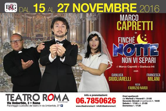Il matrimonio fa paura a tutti, questo è un dato di fatto. Ed è forse per questo che gli autori Gianluca Irti, Marco Capretti, nonché Pablo e Pedro, hanno pensato che i dubbi e le perplessità dell’ultima notte da scapolo potessero essere messe sotto esame per la gioia di chi ancora non ha fatto il grande salto. “Finché notte non vi separi”, in scena in questi giorni al Teatro Roma è un excursus ironico sul difficile diventare mariti, dopo essere stati fidanzati felici. A dare voce al prossimo sposo è Marco Capretti, ormai presenza fissa del programma “Made in Sud”, veterano presenziatore del palcoscenico e che incalza nella commedia come un uomo in preda a tante perplessità prima di convolare a nozze con la sua Francesca, interpretata da una spumeggiante e bravissima Francesca Milani.